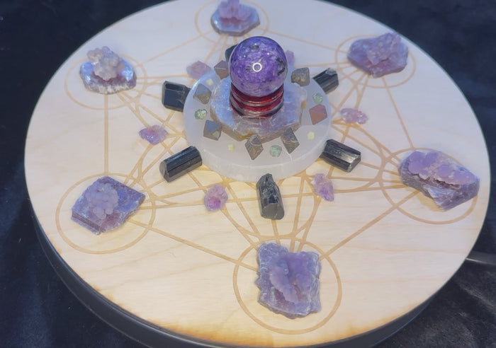 Moving outward, six Skeletal Amethyst lift the vibration while six Black Tourmaline ground and protect the grid, keeping the transformation steady and embodied.